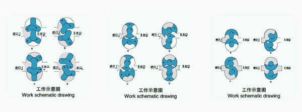 轉(zhuǎn)子泵又稱膠體泵,三葉泵,鞋底泵等。依靠兩同步反向轉(zhuǎn)動的轉(zhuǎn)子(齒數(shù)為2-4)在旋轉(zhuǎn)過程中于進口處產(chǎn)生吸力(真空度),從而吸入所要輸送的物料。兩轉(zhuǎn)子將轉(zhuǎn)子室分隔成幾個小空間,并按a→b→c→d的次序運轉(zhuǎn)。運轉(zhuǎn)至位置a時,只有I室中充滿介質(zhì); 到位置b時,B室中封閉了部分介質(zhì); 到位 置c時,A室中也